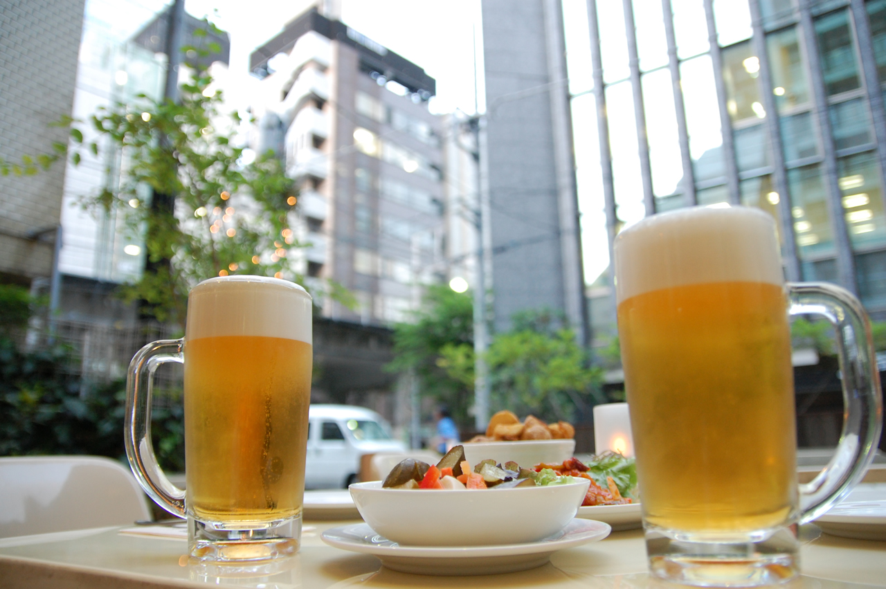 そびえ立つ高層ビル群を見上げ飲むビールは大都会・東京ならでは!